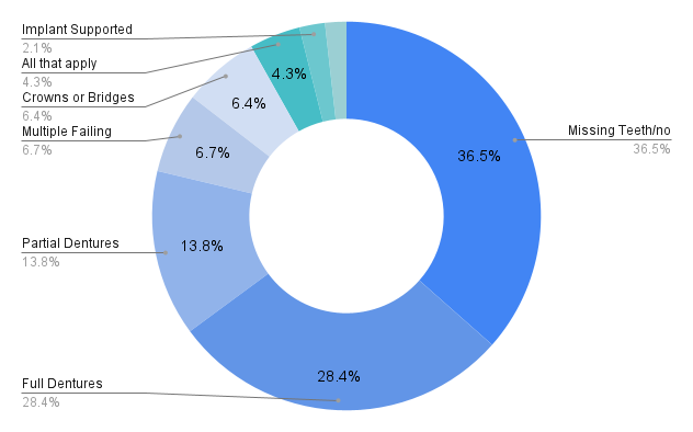 The data makes one thing clear. Whether people are choosing to settle with missing teeth (36.52%), dentures (over 42%), or ongoing dental work, they aren’t in a final solution—they’re in something they’re managing.